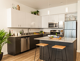 広々としたスペースで、のびのびとお料理を。自動水栓のシンクでは洗い物が捗るなど、最新機器で家事のストレスが大きく軽減します。